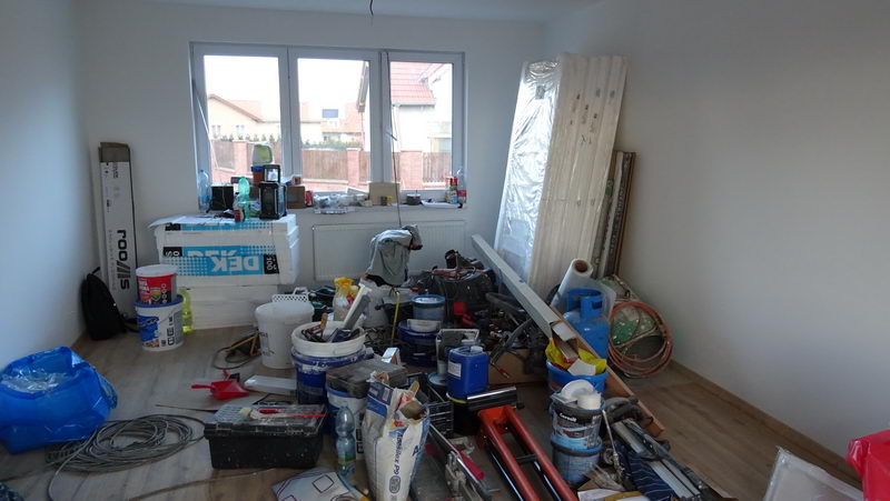 Každá firma přistupuje k předání jinak - ti největší profesionálové předávají dům absolutně čistý, v domě je příjemná teplota, vy se cítíte dobře, jen se nastěhovat. Druhá skupina "sekáme to jako baťa cvičky" dům neuklidí. Okna špinavá,takže nevíte jestli jsou poškrábaná nebo v pořádku, totéž o podlaze. Hasící přístroj či požární hlásič si musíte kupovat sami. A třetí skupina? Říkejme jim "amatéři" - v den předání to vypadá jako na snímku níže. I za ujišťování majitele, že vše bude v ten den hotové dopadla realita jinak. Topení nefunguje, elektrika není dokompletovaná, wc protéká.....